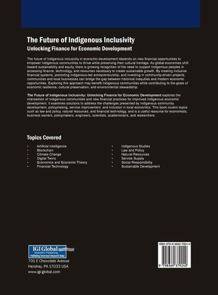 The future of Indigenous inclusivity in economic development depends on new financial opportunities to empower Indigenous communities to thrive while preserving their cultural heritage. As global economies shift toward sustainability and equity, there is growing recognition of the need to support Indigenous peoples in accessing finance, technology, and resources necessary to create sustainable growth. By creating inclusive financial systems, promoting Indigenous-led entrepreneurship, and investing in community-driven projects, communities and local businesses can bridge the gap between historical inequities and modern economic opportunities. Exploring this approach may benefit Indigenous communities while contributing to the goals of economic resilience, cultural preservation, and environmental stewardship. The Future of Indigenous Inclusivity: Unlocking Finance for Economic Development explores the intersection of Indigenous communities and new financial practices for improved Indigenous economic development. It examines solutions to address the challenges presented by Indigenous community development, policymaking, service improvement, and inclusion in local economics. This book covers topics such as law and policy, natural resources, and financial technology, and is a useful resource for economists, business owners, policymakers, engineers, scientists, academicians, and researchers.