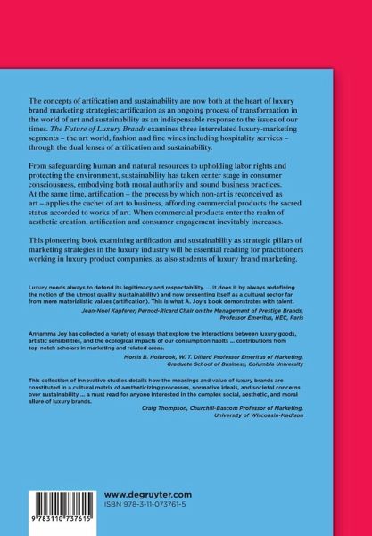 The concepts of artification and sustainability are now both at the heart of luxury brand marketing strategies; artification as an ongoing process of transformation in the world of art and sustainability as an indispensable response to the issues of our times. The Future of Luxury Brands examines three interrelated luxury-marketing segments-the art world, fashion and fine wines including hospitality services-through the dual lenses of sustainability and artification.