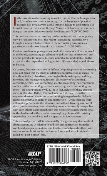 Is the invention of accounting so useful that, as Charlie Munger once said, "you have to know accounting. It's the language of practical business life. It was a very useful thing to deliver to civilization. I've heard it came to civilization through Venice which of course was once the great commercial power in the Mediterranean"? (WOO 2013) This positive view on accounting can be contrasted with an opposing view by Paul Browne that "the recent [accounting] scandals have brought a new level of attention to the accounting profession as gatekeepers and custodians of social interest." (DUM 2013) Contrary to these opposing views (and other ones as will be discussed in the book), accounting (in relation to addition and subtraction) are neither possible (or impossible) nor desirable (or undesirable) to the extent that the respective ideologues (on different sides) would like us to believe. Of course, this reexamination of different opposing views on accounting does not mean that the study of addition and subtraction is useless, or that those fields (related to accounting)-like bookkeeping, auditing, forensics, info management, finance, philosophy of accounting, accounting ethics, lean accounting, mental accounting, environmental audit, creative accounting, carbon accounting, social accounting, and so on-are unimportant. (WK 2013) In fact, neither of these extreme views is plausible. Rather, this book offers an alternative (better) way to understand the future of accounting in regard to the dialectic relationship between addition and subtraction-while learning from different approaches in the literature but without favoring any one of them (nor integrating them, since they are not necessarily compatible with each other). More specifically, this book offers a new theory (that is, the double-sided theory of accounting) to go beyond the existing approaches in a novel way and is organized in four chapters. This seminal project will fundamentally change the way that we think about accounting in relation to addition and subtraction from the combined perspectives of the mind, nature, society, and culture, with enormous implications for the human future and what I originally called its "post-human" fate.
