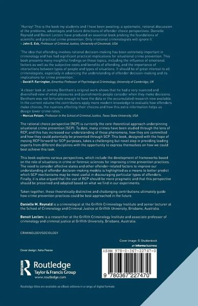 1. What could be the future of rational choice for crime prevention? Benoit Leclerc and Danielle M. Reynald 2. Does situational crime prevention require a rational offender? Richard Wortley and Nick Tilley 3. Hot criminology or what Homer's Odyssea can teach criminologists about decision-making Jean-Louis van Gelder 4. Theorising forensic science: a model for crime prevention Paul Knepper 5. A baseline model of deterrence Matthew Manning 6. Another look at person-situation interaction: what offenders are sensitive to what situational crime prevention measures? Henk Elffers and Danielle M. Reynald