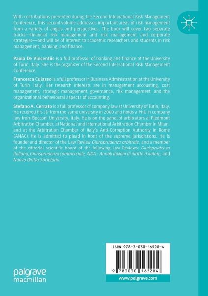 Paola De Vincentiis is a full professor of banking and finance at the University of Turin, Italy. She is the organizer of the Second International Risk Management Conference. Francesca Culasso is a full professor in Business Administration at the University of Turin, Italy. Her research interests are in management accounting, cost management, strategic management, governance, risk management, and the organizational behavioural aspects of accounting. Stefano A. Cerrato is a full professor of company law at University of Turin, Italy. He received his JD from the same university in 2000 and holds a PhD in company law from Bocconi University, Italy. He is on the panel of arbitrators at Piedmont Arbitration Chamber, at National and International Arbitration Chamber in Milan, and at the Arbitration Chamber of Italy's Anti-Corruption Authority in Rome (ANAC). He is admitted to plead in front of the supreme jurisdictions. He is founder and director ofthe Law Review Giurisprudenza arbitrale, and a member of the editorial scientific board of the following Law Reviews: Giurisprudenza italiana, Giurisprudenza commerciale, AIDA - Annali italiani di diritto d'autore, and Nuovo Diritto Societario.