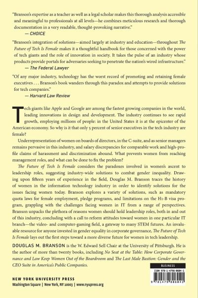 An accessible and timely guide to increasing female presence and leadership in tech companies Tech giants like Apple and Google are among the fastest growing companies in the world, leading innovations in design and development. The industry continues to see rapid growth, employing millions of people: in the US it is at the epicenter of the American economy. So why is it that only 5% of senior executives in the tech industry are female? Underrepresentation of women on boards of directors, in the C-suite, and as senior managers remains pervasive in this industry. As tech companies are plagued with high-profile claims of harassment and discrimination, and salary discrepancies for comparable work, one asks what prevents women from reaching management roles, and, more importantly, what can be done to fix it? The Future of Tech is Female considers the paradoxes involved in women's ascent to leadership roles, suggesting industry-wide solutions to combat gender inequality. Drawing upon 15 years of experience in the field, Douglas M. Branson traces the history of women in the information technology industry in order to identify solutions for the issues facing women today. Branson explores a variety of solutions such as mandatory quota laws for female employment, pledge programs, and limitations on the H1-B VISA program, and grapples with the challenges facing women in IT from a range of perspectives. Branson unpacks the plethora of reasons women should hold leadership roles, both in and out of this industry, concluding with a call to reform attitudes toward women in one particular IT branch, the video and computer gaming field, a gateway to many STEM futures. An invaluable resource for anyone invested in gender equality in corporate governance, The Future of Tech is Female lays out the first steps toward a more diverse future for women in tech leadership