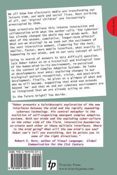Our lives are increasingly spent online. Work, friends, games, reading - all are increasingly digital and virtual. Google Glass is next. How are these extraordinary changes affecting our brains, our minds and the way we think, talk and relate? Parents, scientists, doom-mongers and sociologists are among the many people speculating about what is going to become of us as we become increasingly absorbed by electronic media and ever more remote from our natural environment. Jack Huber is clear that what he calls 'the cyberous' is changing the whole way that our minds work. But he is also clear that we can't hope to understand the effects and implications fully without a better understanding of how the mind came to be what it is over the course of human evolution. So he takes us on a historical and biological tour of the human-mind-in-its-environment and focuses on three 'trajectories' in particular: 1)our capacity to recognise patterns (which includes our capacity to use and understand metaphor), 2) vision (which is much more than sight), 3)post-birth development. From there he looks at how our past will influence our future, giving us a glimpse of what collaboration with cyberous environments will bring to our minds and to 'self' in the future - a glimpse of what and who we will become. In doing so, he suggests three futures of the mind: 1) Unknowable mind, 2)Absentee mind, 3)Transcendent mind. Fascinating stuff! Is the future bright? You decide.