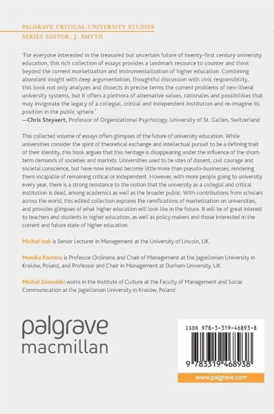 Introduction.- PART I. Dissecting the Status Quo.- Academic Freedom in the Corporate University: Squandering Our Inheritance?; Carl Rhodes.- The University of the Common: Beyond the Contradictions of Higher Education Subsumed under Capital; Krystian Szadkowski.- 'The Last in the Food Chain': Dignity of Polish Junior Academics and Doctoral Candidates in the Face of Performance Management; Michal Zawadzki.- The Culture of Control in the Contemporary University; Lukasz Sulkowski.- PART II. University in Context.- Living in a World of Foam: Global Ideas, Bubbles, Institutions and the Fairy Tale of Business Education; Carmelo Mazza & Paolo Quattrone.- The Future of the University? The Voice of Young Polish Scholars; Anna M. Kola & Krzysztof Leja.- University as a Terminal: Socio-Material Infrastructure for Post-Neoliberal Society; Krzysztof Nawratek.- PART III. Teaching and Research.- McLearning andthe So-Called "Knowledge Society": An Essay; Roy Jacques.- Neoliberalism's War against Higher Education and the Role of Public Intellectuals; Henry A. Giroux.- Re-imagining Business Schools of the Future as Places of Theorizing; Hugo Gaggiotti, Peter Simpson & Svetlana Cicmil.- Re-integrating the Professional Learner: The Complementarity of Teaching and Research in Academic Life; David Sims.- PART IV. Into the Future.- Escape from the Neoliberal Higher Education Prison: A Proposal for a New Digital Communist University; Roger Hallam.- A Curious and Collaborative Future; Todd Hannula.- Speculations on University Futures in 2025: Corporate Cloning, Intellectual Underground, and a New Critical Awareness; George Cairns.- 2021: A Campus Odyssey; Monika Kostera.- Anti-Coda.-