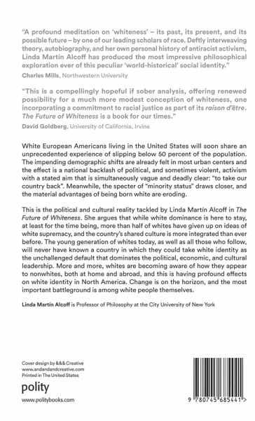 This is the political and cultural reality tackled by Linda Martín Alcoff in The Future of Whiteness. She argues that whiteness is here to stay, at least for a while, but that half of whites have given up on ideas of white supremacy, and the shared public, material culture is more integrated than ever. More and more, whites are becoming aware of how they appear to non-whites, both at home and abroad, and this is having profound effects on white identity in North America. The young generation of whites today, as well as all those who follow, will have never known a country in which they could take white identity as the unchallenged default that dominates the political, economic and cultural leadership. Change is on the horizon, and the most important battleground is among white people themselves.