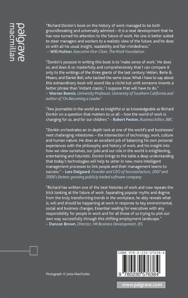 'Richard Donkin's book on the history of work managed to be both groundbreaking and universally admired - it is a neat development that he has now turned his attention to the future of work. No one is better suited to steer managers and workers to a realistic view of the future and he does so with all his usual insight, readability and fair-mindedness.' - Will Hutton, Executive Vice-Chair, The Work Foundation