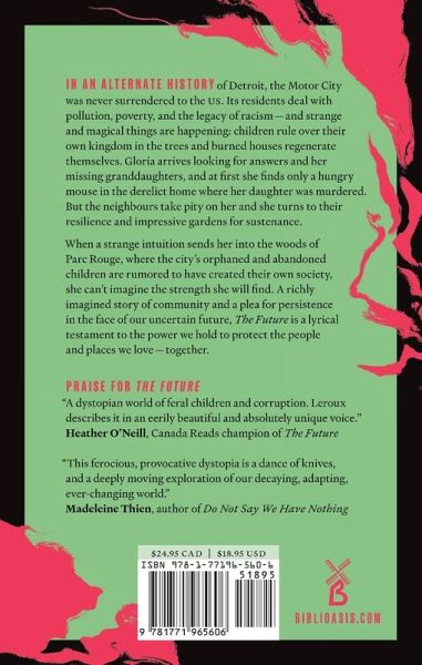 Winner of Canada Reads 2024 • Longlisted for the 2025 Dublin Literary Award • Longlisted for the 2024 Carol Shields Prize for Fiction • One of Tor.com 's Can't Miss Speculative Fiction for Fall 2023 • Listed in CBC Books Fiction to Read in Fall 2023 • One of Kirkus Reviews' Fall 2023 Big Books By Small Presses • A Kirkus Review Work of Translated Fiction To Read Now • One of CBC Books Best Books of 2023 • A CBC Books Bestselling Canadian Book of the Week In an alternate history in which the French never surrendered Detroit, children protect their own kingdom in the trees. In an alternate history of Detroit, the Motor City was never surrendered to the US. Its residents deal with pollution, poverty, and the legacy of racism—and strange and magical things are happening: children rule over their own kingdom in the trees and burned houses regenerate themselves. When Gloria arrives looking for answers and her missing granddaughters, at first she finds only a hungry mouse in the derelict home where her daughter was murdered. But the neighbours take pity on her and she turns to their resilience and impressive gardens for sustenance. When a strange intuition sends Gloria into the woods of Parc Rouge, where the city’s orphaned and abandoned children are rumored to have created their own society, she can’t imagine the strength she will find. A richly imagined story of community and a plea for persistence in the face of our uncertain future, The Future is a lyrical testament to the power we hold to protect the people and places we love—together.