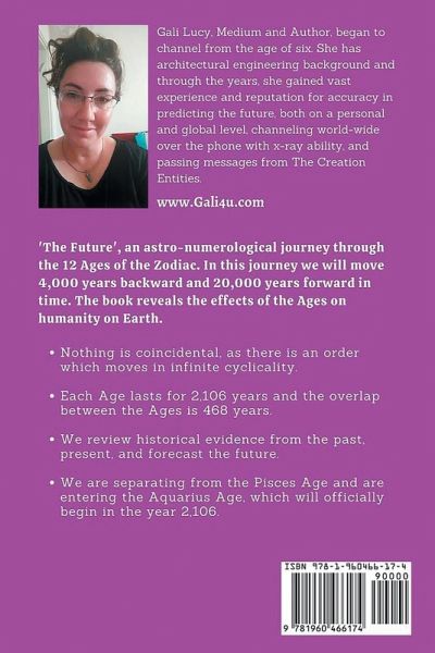 'The Future', an astro-numerological journey through the 12 Ages of the Zodiac. In this journey we will move 4,000 years backward and 20,000 years forward in time. The book reveals the effects of the Ages on humanity on Earth. Nothing is coincidental, as there is an order which moves in infinite cyclicality. Each Age lasts for 2,106 years and the overlap between the Ages is 468 years. We review historical evidence from the past, present, and forecast the future. We are separating from the Pisces Age and are entering the Aquarius Age, which will officially begin in the year 2,106. The Future: Based on the Ages theory is book #3 in the Gali Lucy Predictions Series: Book #1: Divine Creation Book #2: The Aquarius Age Book #3: The Future: Based on the Ages theory Book #4: Messages from the Mystical Cards Book #5: Lenormand Tarot Deck Meaning: A guidebook channeled through Anne-Marie Adelaide's spirit Gali Lucy, Medium, Author, Singer, Composer, and Architecture Engineer, who channels with The Creation Entities since the age of six, using only her brain without additional tools. She is highly respected around the world for her astonishing accuracy in predicting the future, both on a personal and global level, using X-ray remote vision ability. She consults on a wide variety of topics around the world. All of her books were dictated to her through channeling. www.Gali4u.com