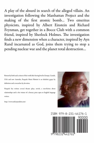 A play of the absurd in search of the alleged villain. An investigation following the Manhattan Project and the making of the first atomic bomb... Two emeritus physicists, inspired by Albert Einstein and Richard Feynman, get together in a Bocce Club with a common friend, inspired by Sherlock Holmes. The investigation finds a new dimension when a character, inspired by Ayn Rand incarnated as God, joins them trying to stop a pending nuclear war and the planet total destruction...
