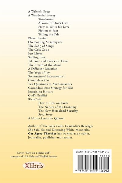 A Writer's Notes A Wonderful Frenzy Wordsword A Voice of One's Own How to Write for Love Fiction as Fact Telling the Tale Planet Patriot Overcoming Metaphysics The Song of Songs The Gaia Code Just Listen Smiling Eyes Til Time and Times are Done The Breath of the Mind A Different Direction The Yoga of Joy Sacramentos! Sacramentos! Cassandra's Cat Ten Questions to Ask Cassandra Cassandra's Exit Strategy for War Imagining History God's Graffiti RichCraft How to Live on Earth The Nature of the Economy The New Homeland Security The Whole School A Norse-American Quartet Author of The Gaia Code, Cassandra's Revenge, She Said No and Dreaming White Mountain, Ger Agrey-Thatcher has worked as an editor, journalist, publisher and teacher.