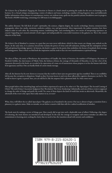 The Galactic Era of Mankind: Engaging the Transition to Oneness is a book aimed at priming the reader for the new era looming on the horizon. It is a broad critique encompassing a variety of subjects and issues, including a number of long forgotten ideas and deliberately hidden information whose absence in contemporary society, not without irony, spells out the painful systemic breakdown now in progress. The book is 90,000 words long, containing over 200 items in its bibliography. The author discusses "the full deck of cards": spirituality, the sciences, religious dogma, the occult, technology, history, extraterrestrials, propaganda, ethics, law, media, mysticism, aesthetics, politics, war, and government. More importantly, the author examines how these subjects relate to each other. By contrasting notions, establishing links, and correlating ideas, new means of interpreting experience are created. Upgrading one's mental attitude is both urgent and indispensable for a successful transition to the galactic era. This is the central objective of the book. The Galactic Era of Mankind is a journey to a past that you were never told about, which for that reason can change your outlook on the future. At the same time, it is a journey inward that reclaims the power of virtue and self-realization, dealing with the redemption of free will and spiritual knowledge (gnosis). At bottom, the book is a quest for the purity that symbolizes the heroes of mankind, their message and lasting power. That is where we find both the inspiration and the tools to face our own transformation as spiritual beings. The ideas of Plato, the music of Beethoven, the nonviolence of Gandhi, the clarity of Averroes, the numbers of Pythagoras, the muses of Friedrich Schiller, the clairvoyance of Nikola Tesla, the holiness of Jesus, the courage of Alexander of Macedon, to cite but a few of the exponents discussed in the book, are revealed to be expressions of a same set of instructions whose purpose is to free the human individual from ignorance and fear. One can hardly think of a more timely message. After all, the Internet has by now shown to everyone that the world we knew just one generation ago has crumbled. There is no credibility left because the corruption is ubiquitous. Simple as that. Everyone knows it and even those affected by cognitive dissonance can feel it. The world we knew is gone; it passed. Sure, you can still feel it, like the amputee feels a phantom limb. So, what comes next? Most people believe that something huge and never before experienced is upon us. So, what is it? The Apocalypse? The Second Coming of Christ? The end of times? Ascension? Judgment Day? Revelation? The Great Awakening? Admittedly, each one of these events is supposed to change the order of things and purify the world. Yet, none of them depicts the kind of world that awaits us afterwards. Meanwhile, the aftermath of the event is the aspect that really matters to us, is it not? What, then, will follow the so-called Apocalypse? The galactic era of mankind is the answer. Our race is about to begin a transition from a planetary to a galactic status. Make no mistake, we are before a massive shift that calls for a radical recalibration of mindset. The book starts by making a review of things past. How exactly did we get into such a deplorable state of affairs? Following a fair degree of reckoning, the main themes are introduced and developed. In the end, the courage to recognize and correct mistakes can affirm our commitment to learning anew, seeking the clarity that we need to face the transition ahead with serenity and confidence.