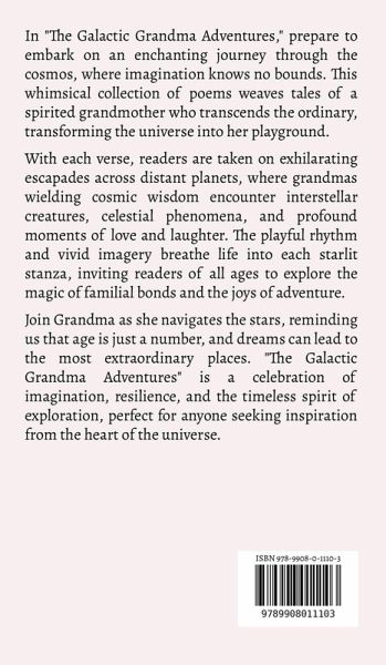 In "The Galactic Grandma Adventures," prepare to embark on an enchanting journey through the cosmos, where imagination knows no bounds. This whimsical collection of poems weaves tales of a spirited grandmother who transcends the ordinary, transforming the universe into her playground. With each verse, readers are taken on exhilarating escapades across distant planets, where grandmas wielding cosmic wisdom encounter interstellar creatures, celestial phenomena, and profound moments of love and laughter. The playful rhythm and vivid imagery breathe life into each starlit stanza, inviting readers of all ages to explore the magic of familial bonds and the joys of adventure. Join Grandma as she navigates the stars, reminding us that age is just a number, and dreams can lead to the most extraordinary places. "The Galactic Grandma Adventures" is a celebration of imagination, resilience, and the timeless spirit of exploration, perfect for anyone seeking inspiration from the heart of the universe.