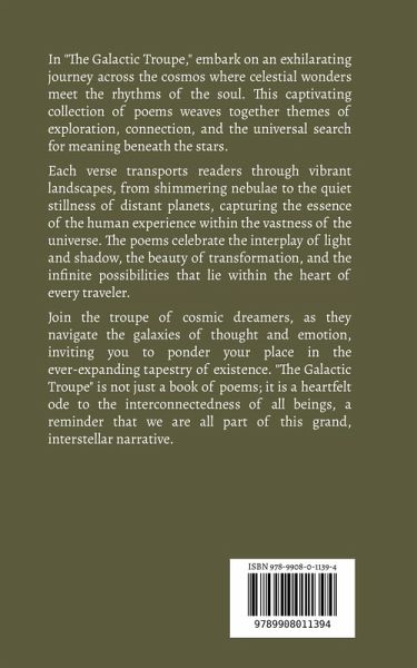 In "The Galactic Troupe," embark on an exhilarating journey across the cosmos where celestial wonders meet the rhythms of the soul. This captivating collection of poems weaves together themes of exploration, connection, and the universal search for meaning beneath the stars. Each verse transports readers through vibrant landscapes, from shimmering nebulae to the quiet stillness of distant planets, capturing the essence of the human experience within the vastness of the universe. The poems celebrate the interplay of light and shadow, the beauty of transformation, and the infinite possibilities that lie within the heart of every traveler. Join the troupe of cosmic dreamers, as they navigate the galaxies of thought and emotion, inviting you to ponder your place in the ever-expanding tapestry of existence. "The Galactic Troupe" is not just a book of poems; it is a heartfelt ode to the interconnectedness of all beings, a reminder that we are all part of this grand, interstellar narrative.