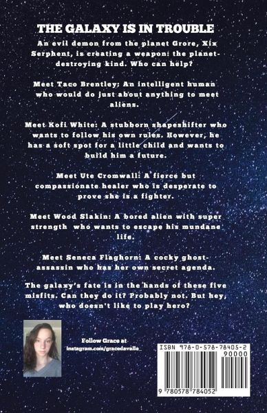 The galaxy is in trouble. An evil demon from the planet Grore, Xix Serphent, is creating a weapon: the planet-destroying kind. Who can help? The galaxy's fate is in the hands of five misfits. Can they stop Xix in time? Will they put their personal quests aside for the greater good? Battle after battle, the five individuals will eventually learn that making their own decisions is not an option in order to survive! Meet Taco Brentley: An intelligent human from Earth who would do just about anything to meet aliens. Meet Kofi White: A stubborn shapeshifter who wants to follow his own rules. However, on the planet Mersey, he has a soft spot for a little child and wants to build him a future. Meet Ute Cromwall: A fierce but compassionate healer from the planet Aketi, desperate to prove to herself she is a fighter. Meet Wood Slakin: A bored alien with super strength from the planet Orion who wants to escape his mundane life. Meet Seneca Flaghorn: A cocky ghost-assassin from the planet Hox who has her own secret agenda. When offered to save their dying planets from an evil demon Xix, they are all but forced to accept. Who doesn't like to play hero? Searching across the galaxy, these unlikely companions try to obtain the fireflies, magical pieces of light that can obliterate the darkness, before time runs out.