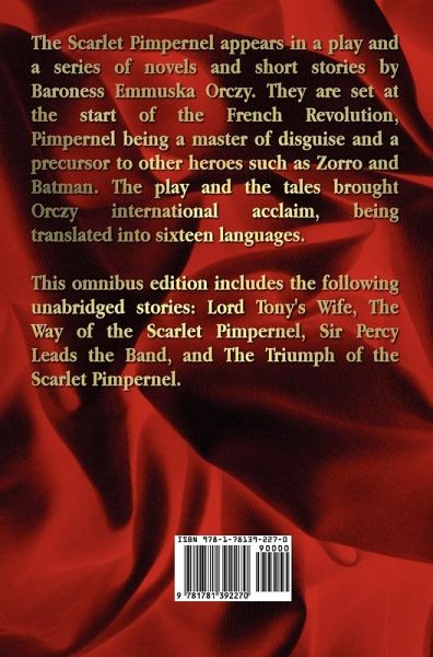 The Scarlet Pimpernel appears in a play and a series of novels and short stories by Baroness Emmuska Orczy. They are set at the start of the French Revolution, Pimpernel being a master of disguise and a precursor to other heroes such as Zorro and Batman. The play and the tales brought Orczy international acclaim, being translated into sixteen languages. This omnibus edition includes the following unabridged stories: Lord Tony's Wife, The Way of the Scarlet Pimpernel, Sir Percy Leads the Band, and The Triumph of the Scarlet Pimpernel.