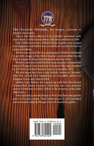 The Gallant Pioneers, like Rangers, continues to prosper and endure. This is the fourth edition of the critically acclaimed early years' history of the famous Ibrox club, first published in 2009. Our 150th anniversary edition brings together new images and insights, never before seen or widely discussed, for fans to enjoy and debate. We have uncovered the only photograph of William McBeath to go with images of his fellow founders and youthful friends Peter Campbell, Moses McNeil and his brother Peter. We have also uncovered the first match report to feature the name of 'Rangers' and reveal why we believe they were founded in 1872 but took their famous name in September 1873. We also argue they were a side initially known as 'Western', who first earned their reputation on the public pitches of Glasgow Green and Queen's Park. Author Gary Ralston has teamed up with Iain McColl and Gordon Bell, whose Founders' Trail tours have now attracted almost 10,000 fans to Follow Follow in the footsteps of the club's fabled sons. Four lads had a shared dream in West End Park that quickly grew to become reality. Their achievement is still cherished and treasured today by Rangers fans all around the globe.