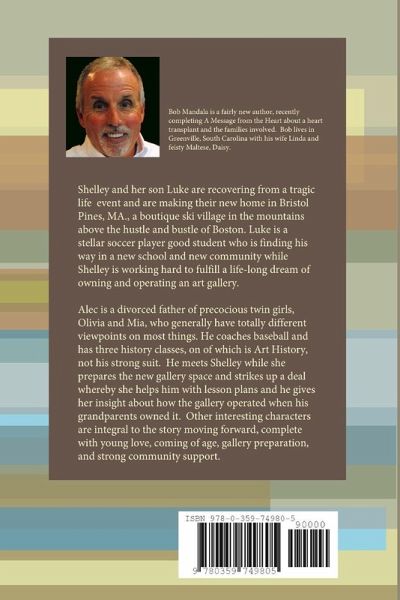 Shelley and her son Luke are recovering from a tragic life event and are making their new home in Bristol Pines, MA., a boutique ski village in the mountains above the hustle and bustle of Boston. Luke is a star soccer player and a good student who is finding his way in a new school and new community while Shelley is working hard to fulfill a life-long dream of owning and operating an art gallery. Alec is a divorced father of precocious twin girls, Olivia and Mia, who generally have different viewpoints on most things. He coaches baseball and has three history classes, one of which is Art History, not his strong suit. He meets Shelley while she prepares the new gallery space and strikes up a deal whereby she helps him with lesson plans, and he gives her insight into how the gallery operated when his grandparents owned it. Other interesting characters are integral to the story moving forward, complete with young love, coming of age, gallery preparation, and strong community support.