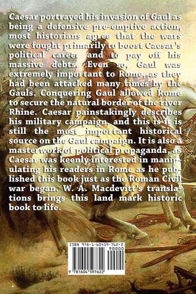 Caesar portrayed his invasion of Gaul as being a defensive pre-emptive action, most historians agree that the wars were fought primarily to boost Caesar's political career and to pay off his massive debts. Even so, Gaul was extremely important to Rome, as they had been attacked many times by the Gauls. Conquering Gaul allowed Rome to secure the natural border of the river Rhine. Caesar painstakingly describes his military campaign, and this is it is still the most important historical source on the Gaul campaign. It is also a masterwork of political propaganda, as Caesar was keenly interested in manipulating his readers in Rome as he published this book just as the Roman Civil war began. W. A. Macdevitt's translations brings this land mark historic book alive.