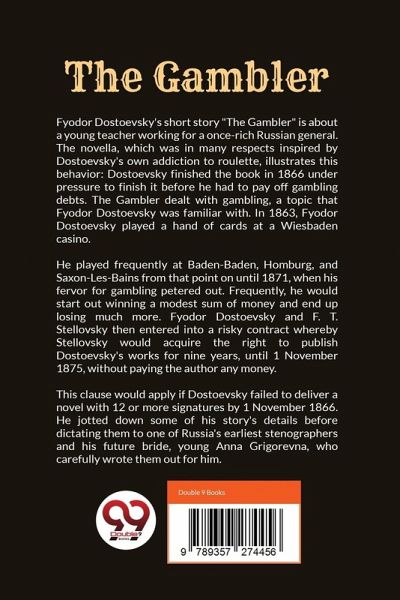 Fyodor Dostoevsky's short story "The Gambler" is about a young teacher working for a once-rich Russian general. The novella, which was in many respects inspired by Dostoevsky's own addiction to roulette, illustrates this behavior: Dostoevsky finished the book in 1866 under pressure to finish it before he had to pay off gambling debts. The Gambler dealt with gambling, a topic that Fyodor Dostoevsky was familiar with. In 1863, Fyodor Dostoevsky played a hand of cards at a Wiesbaden casino. He played frequently at Baden-Baden, Homburg, and Saxon-Les-Bains from that point on until 1871, when his fervor for gambling petered out. Frequently, he would start out winning a modest sum of money and end up losing much more. Fyodor Dostoevsky and F. T. Stellovsky then entered into a risky contract whereby Stellovsky would acquire the right to publish Dostoevsky's works for nine years, until 1 November 1875, without paying the author any money. This clause would apply if Dostoevsky failed to deliver a novel with 12 or more signatures by 1 November 1866. He jotted down some of his story's details before dictating them to one of Russia's earliest stenographers and his future bride, young Anna Grigorevna, who carefully wrote them out for him.
