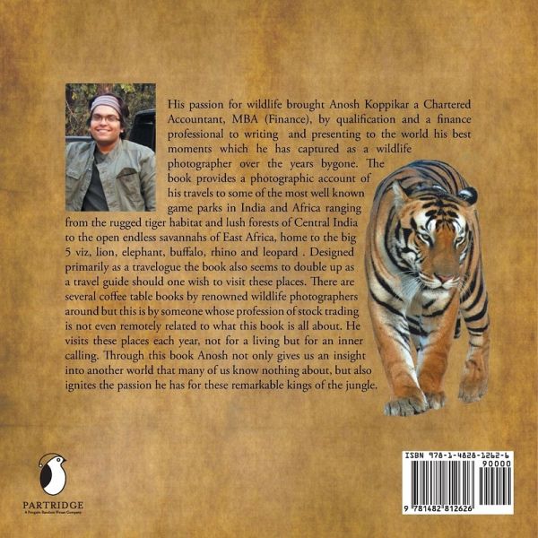 His passion for wildlife brought Anosh Koppikar, a stock market person to writing and presenting to the world his best moments which he has captured as a wildlife photographer over the years bygone. The book provides a photographic account of his travels to some of the most well known game parks in India and Africa ranging from the rugged tiger habitat and lush forests of Central India (Kanha, Bandhavgarh, Pench and Tadoba) to the open endless savannahs of East Africa ( Masai Mara, Serengeti, Ngorongoro and Lake Manyara) which is home to the big 5 viz, lion, elephant, buffalo, rhino and leopard . Designed primarily as a travelogue the book also seems to double up as a travel guide should one wish to visit these places. There are several coffee table books by renowned wildlife photographers around but this is by someone whose profession of stock trading is not even remotely related to what this book is all about. He visits these places each year, not for a living but for an inner calling. Through this book Anosh not only gives us insight into another world that many of us know nothing about, but also ignite the passion he has for these remarkable kings of the jungle.