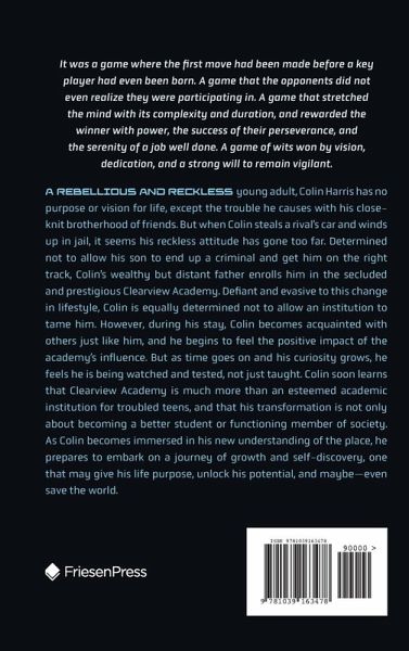 It was a game where the first move had been made before a key player had even been born. A game that the opponents did not even realize they were participating in. A game that stretched the mind with its complexity and duration, and rewarded the winner with power, the success of their perseverance, and the serenity of a job well done. A game of wits won by vision, dedication, and a strong will to remain vigilant. A REBELLIOUS AND RECKLESS young adult, Colin Harris has no purpose or vision for life, except the trouble he causes with his closeknit brotherhood of friends. But when Colin steals a rival's car and winds up in jail, it seems his reckless attitude has gone too far. Determined not to allow his son to end up a criminal and get him on the right track, Colin's wealthy but distant father enrolls him in the secluded and prestigious Clearview Academy. Defiant and evasive to this change in lifestyle, Colin is equally determined not to allow an institution to tame him. However, during his stay, Colin becomes acquainted with others just like him, and he begins to feel the positive impact of the academy's influence. But as time goes on and his curiosity grows, he feels he is being watched and tested, not just taught. Colin soon learns that Clearview Academy is much more than an esteemed academic institution for troubled teens, and that his transformation is not only about becoming a better student or functioning member of society. As Colin becomes immersed in his new understanding of the place, he prepares to embark on a journey of growth and self-discovery, one that may give his life purpose, unlock his potential, and maybe-even save the world.