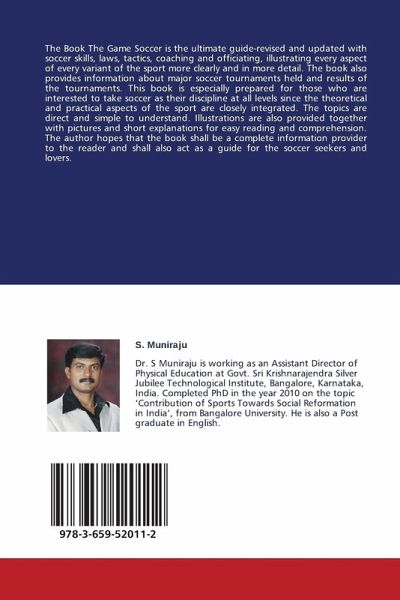 The Book The Game Soccer is the ultimate guide-revised and updated with soccer skills, laws, tactics, coaching and officiating, illustrating every aspect of every variant of the sport more clearly and in more detail. The book also provides information about major soccer tournaments held and results of the tournaments. This book is especially prepared for those who are interested to take soccer as their discipline at all levels since the theoretical and practical aspects of the sport are closely integrated. The topics are direct and simple to understand. Illustrations are also provided together with pictures and short explanations for easy reading and comprehension. The author hopes that the book shall be a complete information provider to the reader and shall also act as a guide for the soccer seekers and lovers.