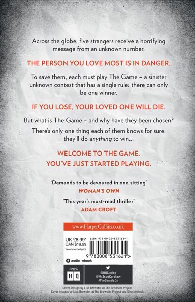 To save their life, you have to play. *The #1 audio bestseller* 'Subversive and gripping' S J Watson 'Dark, fiendish, riveting' Janice Hallett 'Exciting and original' Simon McCleave 'This year's must-read thriller' Adam Croft ___ Across the globe, five strangers receive a horrifying message from an unknown number. THE PERSON YOU LOVE MOST IS IN DANGER. To save them, each must play The Game - a sinister unknown entity that has a single rule: there can only be one winner. IF YOU LOSE, YOUR LOVED ONE WILL DIE. But what is The Game - and why have they been chosen? There's only one thing each of them knows for sure: they'll do anything to win... WELCOME TO THE GAME. YOU'VE JUST STARTED PLAYING. ___ A breakneck thriller filled with non-stop suspense, perfect for fans of Harlan Coben, Mark Dawson and Terry Hayes' I Am Pilgrim. Readers love The Game: 'This was an absolute belter of a book!' 'Wow! Can absolutely see this book being made into a film. . . The whole book pulled me in straight away and I couldn't put it down. Full of twists from start to finish, twists that I never saw coming!' 'Had me gripped . . . I couldn't breathe until I finished it' 'This is one of the most original stories I've read for a while. Just read it! You won't regret it.' 'What an utterly terrifying thriller this was! It doesn't get scarier than this...' 'Horrifyingly credible . . . This is a fast-paced, menacing and dark read. Grips from the off and doesn't let go until that very last page.' 'This book was chilling and tense and will have you on the edge of your seat.' 'Unique, cinematic and fast-paced. Unputdownable and thrilling page-turner. Highly recommended.' 'I love a story that is a bit different and unique and this certainly was. A thought provoking story that chilled me to the bone . . . Will have you up all night. Such a cleverly written story' 'Fast-paced, tense, atmospheric and so full of suspense . . . I didn't know what to expect when. I couldn't put this book down it was completely gripping.' 'From the first few pages the adrenaline rush never lets up.'