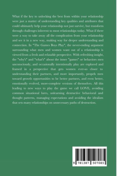 What if the key to unlocking the best from within your relationship were just a matter of understanding key qualities and attributes that could ultimately help your relationship not just survive, but transform through challenges inherent to most relationships today. What if there were a way to take away all the complication from your relationship and see it in a new way, making way for deeper understanding and connection. In "The Games Boys Play", the never-ending argument surrounding what men and women want out of a relationship is viewed from a fresh and relatable perspective. With refreshing insight, the "why's" and "what's" about the inner "games" or behaviors men unconsciously, and occasionally intentionally play are explored and framed in a perspective that gets women ever-so closer to understanding their partners, and more importantly, propels men toward growth opportunities to be better partners, and even better, emotionally evolved, more-complete versions of themselves. All this leading to new ways to play the game we call LOVE, avoiding common situational lures, unlearning destructive behavioral and thought patterns, managing expectations and avoiding the idealism that sets many relationships on unnecessary paths of destruction.