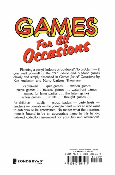 Games for All Occasions. Planning a party? Indoors or outdoors? No problem--if you avail yourself of the 297 indoor and outdoor games clearly and simply described in Games for All Occasions by Ken Anderson and Morry Carlson. There are icebreakers. . .quiz games. . .written games. . .picnic games. . .musical games. . .waterfront games. . .games for lawn parties. . .the latest games. . .action games. . .stunts. . .thought games. . .for children--adults--group leaders--party hosts--teachers--parents--the young in heart--for all who want to entertain or be entertained. No matter what the occasion, there is bound to be an appropriate game in this handy, indexed collection assembled for you fun and recreation!