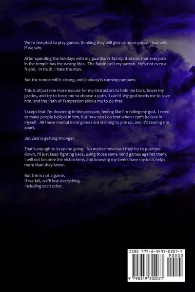 We're tempted to play games, thinking they will give us more power - but that only works if we win. After spending the holidays with my guardian's family, it seems that everyone in the temple has the wrong idea. The Baron isn't my patron. He's not even a friend. In truth, I hate the man. But the rumor mill is strong, and jealousy is running rampant. This is all just one more excuse for my instructors to hold me back, lower my grades, and try to force me to choose one path. I can't! My god needs me to save him, and the Path of Temptation gives me the power to do that. Except that I'm drowning in the pressure, feeling like I'm failing my god. I need to make people believe in him, but how can I do that when I can't believe in myself? All these mind games are starting to pile up, and it's tearing me apart. But Zeal is getting stronger. That's enough to keep me going. No matter how hard they try to push me down, I'll just keep fighting back, learning to play this game better each time. I will not become the victim here, because I'm not doing this alone. My lovers will always stand with me. But this is not a game. If we fail, we'll lose everything - Including each other.