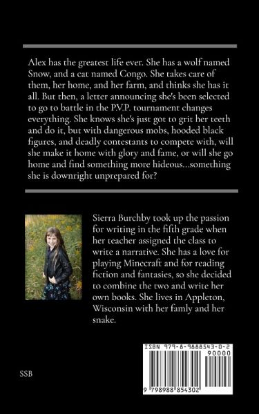 Alex has the greatest life ever. She has a wolf named Snow, and a cat named Congo. She takes care of them, her home, and her farm, and thinks she has it all. But then, a letter announcing she's got to go to battle in the P.V.P. tournament changes everything. She knows she's just got to grit her teeth and do it, but with dangers mobs, hooded black figures, and deadly contestants to compete with, will she make it home with the glory and fame, or will she go home and find something more hideous, something, she was just downright unprepared for?