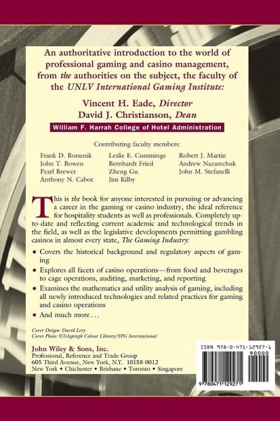 An authoritative introduction to the world of professional gaming and casino management, from the authorities on the subject, the faculty of the UNLV International Gaming Institute: Vincent H. Eade, Director David J. Christianson, Dean William F. Harrah College of Hotel Administration Contributing faculty members: Frank D. Borsenik Leslie E. Cummings Robert J. Martin John T. Bowen Bernhardt Fried Andrew Nazarechuk Pearl Brewer Zheng Gu John M. Stefanelli Anthony N. Cabot Jim Kilby This is the book for anyone interested in pursuing or advancing a career in the gaming or casino industry, the ideal reference for hospitality students as well as professionals. Completely up-to-date and reflecting current academic and technological trends in the field, as well as the legislative developments permitting gambling casinos in almost every state, The Gaming Industry: * Covers the historical background and regulatory aspects of gaming * Explores all facets of casino operations--from food and beverages to cage operations, auditing, marketing, and reporting * Examines the mathematics and utility analysis of gaming, including all newly introduced technologies and related practices for gaming and casino operations * And much more...