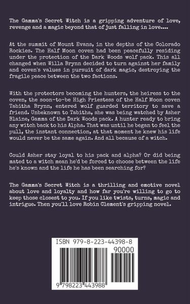 The Gamma's Secret Witch is a gripping adventure of love, revenge and a magic beyond that of just falling in love... At the summit of Mount Evans, in the depths of the Colorado Rockies. The Half Moon coven had been peacefully residing under the protection of the Dark Woods wolf pack. This all changed when Willa Brynn decided to turn against her family and coven's values in pursuit of dark magic, destroying the fragile peace between the two factions. With the protectors becoming the hunters, the heiress to the coven, the soon-to-be High Priestess of the Half Moon coven Tabitha Brynn, entered wolf guarded territory to save a friend. Unbeknown to Tabitha, she was being watched by Asher Blaine, Gamma of the Dark Woods pack. A hunter ready to bring any witch back to his Alpha. That was until he began to feel the pull, the instant connection, at that moment he knew his life would never be the same again. And all because of a witch. Could Asher stay loyal to his pack and alpha? Or did being mated to a witch mean he'd be forced to choose between the life he's known and the life he has been searching for? The Gamma's Secret Witch is a thrilling and emotive novel about love and loyalty and how far you're willing to go to keep those closest to you. If you like twists, turns, magic and intrigue. Then you'll love Robin Clement's gripping novel.