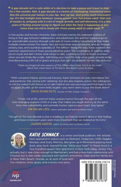 A gap decade isn't a cute whim of a decision to take a pause and travel to Italy for a few months. Nah. A gap decade is a cluster of challenging, transitional years that the universe just dumps in your lap. And my lap. And pretty much everyone's lap. It's that twilight zone between 'young person' and 'full-blown adult' that sort of washes in, bringing with it a bit of chaos, growth, and self-discovery. It is a few years of flailing around, trying to figure out what the heck is happening as you move from not old to kinda old. From young adult to adult adult. The gap decade is that sometimes difficult transitional season young adults face in their twenties and early thirties. In this quirky and honest chronicle, Katie Schnack names the awkward realities of living in that gap between adolescence and adulthood. She and her husband go on an unpredictable journey through a decade of never-ending transitions as they make multiple moves across five states, face job interviews and tax returns, and go through anxiety, loss, pregnancy, and countless episodes of The Office.* Along the way, Schnack explores the common experiences of these young adulting years: The uncertainty of waiting when you're stuck and don't know what steps to take. Learning to trust in God's provision when you are broke like a joke. Admitting your need for help when panic attacks strike. And discovering a life full of grace and joys that can't be ordered via two-day delivery. *Katie has binged all nine seasons of The Office--four times. Don't do the math about how many hours of TV that is. She doesn't want to know.