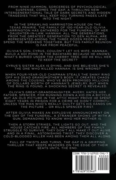 From Ninie Hammon, sorceress of psychological suspense, comes The Gap, a thrilling new intergenerational tale of dark secrets and hidden tragedies that will keep you turning pages late into the night. In the sprawling Harrington House on the Texas prairie, the family of 100-year-old Olivia Harrington has gathered for the funeral of her daughter-in-law, Hannah. All the generations, from The Greatest Generation to Gen Alpha, are represented among the three dozen people who spend the weekend together. But this family reunion is far from peaceful. Olivia's son, Cyrus, couldn't let his wife, Hannah, build a koi pond in the backyard because he knows what's buried under the cherry tree. Did he kill her to keep the secret? Cyrus's sister Alex is dying, and she believes she's the one who killed Hannah. Is she wrong? When four-year-old Chapman steals the shiny ring off his dead grandmother's body, it creates chaos among the cousins, who've been promised millions of dollars worth of Hannah's jewelry. But when the ring is found, a shocking secret is revealed. Olivia's great-granddaughter, Avery, hates her father, Spencer, for running down a kid on a bicycle. But an old picture in the attic might prove he spent eight years in prison for a crime he didn't commit- unless the man who's really guilty gets his hands on the picture ... or kills Spencer first. After Olivia makes an explosive announcement on the day of the funeral, a stranger shows up with a gun, demanding to know who her mother is. Then a storm strikes, the lights go out, and the house catches fire. All members of the family struggle to survive. They don't all make it out alive. And in a final, astonishing twist, they discover a cold-blooded killer has been among them all along. Full of twists and turns, The Gap is a gripping thriller that keeps readers on the edge of their seats until the end.