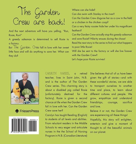 The Garden Crew are Back! And the next adventure will have you yelling, "Run, Rosie, Run!" A greedy salesman is determined to sell Rosie to a factory. But the Garden Crew fall in love with her sweet little face and will do anything to save her. What can they do? Where can she hide? Can she swim with Stanley in the river? Can the Garden Crew disguise her as a cow in the field or a chicken in the chicken coop? Can a very feisty rooster hide her under his magnificent feathers? Can the Garden Crew actually stop this greedy salesman and save Rosie? Hilarity ensues during the chase! Read the next story in the series to find out what happens to poor little Rosie! Will she be sent to the factory or will she live forever with the Garden Crew? Let's hope poor Rosie survives!