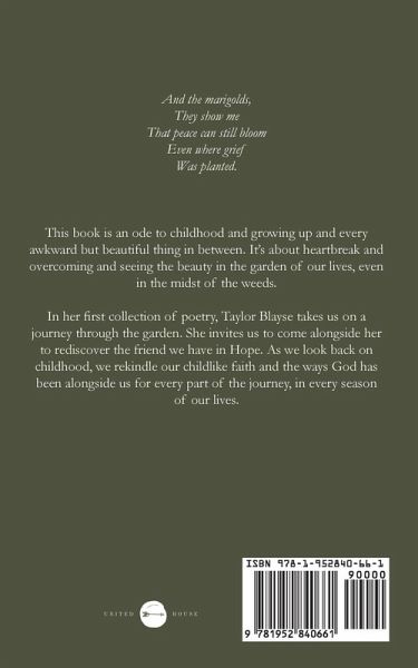 And the marigolds, They show me That peace can still bloom Even where grief Was planted. This book is an ode to childhood and growing up and every awkward but beautiful thing in between. It's about heartbreak and overcoming and seeing the beauty in the garden of our lives, even in the midst of the weeds. In her first collection of poetry, Taylor Blayse takes us on a journey through the garden. She invites us to come alongside her to rediscover the friend we have in Hope. As we look back on childhood, we rekindle our childlike faith and the ways God has been alongside us for every part of the journey, in every season of our lives.
