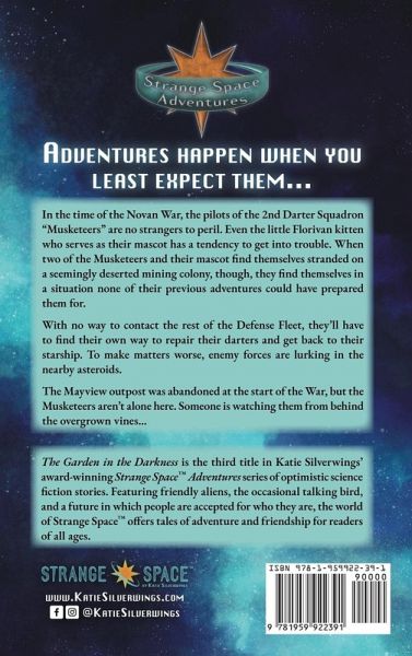 Adventures happen when you least expect them...¿ In the time of the Novan War, the pilots of the 2nd Darter Squadron "Musketeers" are no strangers to peril. Even the little Florivan kitten who serves as their mascot has a tendency to get into trouble. When two of the Musketeers and their mascot find themselves stranded on a seemingly deserted mining colony, though, they find themselves in a situation none of their previous adventures could have prepared them for. ¿ With no way to contact the rest of the Defense Fleet, they'll have to find their own way to repair their darters and get back to their starship. To make matters worse, enemy forces are lurking in the nearby asteroids. ¿ The Mayview outpost was abandoned at the start of the War, but the Musketeers aren't alone here. Someone is watching them from behind the overgrown vines... ¿The Garden in the Darkness: A Strange Space(TM) Novel is the third installment in Katie Silverwings' award-winning Strange Space(TM) Adventures series of optimistic science fiction stories. Featuring friendly aliens, the occasional talking bird, and a future in which people are accepted for who they are, the world of Strange Space(TM) offers tales of adventure and friendship for readers of all ages.