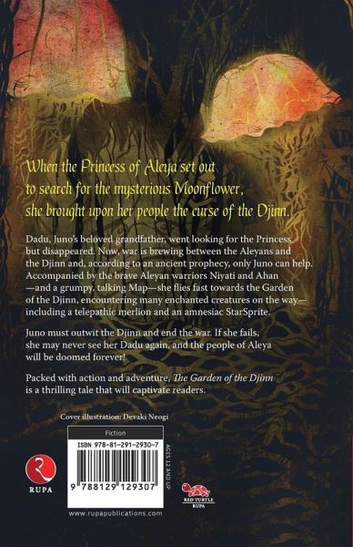 When the Princess of Aleya set out to search for the mysterious Moonflower, she brought upon her people the curse of the Djinn. Dadu, Juno's beloved grandfather, went looking for the Princess but disappeared. Now, war is brewing between the Aleyans and the Djinn and, according to an ancient prophecy, only Juno can help. Accompanied by the brave Aleyan warriors Niyati and Ahan-and a grumpy, talking Map-she flies fast towards the Garden of the Djinn, encountering many enchanted creatures on the way-including a telepathic merlion and an amnesiac StarSprite. Juno must outwit the Djinn and end the war. If she fails, she may never see her Dadu again, and the people of Aleya will be doomed forever! Packed with action and adventure, The Garden of the Djinn is a thrilling tale that will captivate readers.