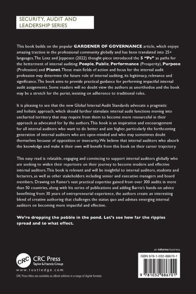 This book builds on the popular GARDENER OF GOVERNANCE article, which enjoys amazing traction in the professional community globally and has been translated into 25+ languages. The Lenz and Jeppesen (2022) thought-piece introduced the 5 "Ps" as paths for the betterment of internal auditing: People, Public, Performance (Prosperity), Purpose (Profession) and Planet. These main fields of action and focus for the internal audit profession may determine the future role of internal auditing, its legitimacy, relevance and significance. The book aims to provide practical guidance for performing impactful internal audit assignments. Some readers will no doubt view the authors as unorthodox and the book may be a stretch for the purist, insisting on adherence to traditional rules.