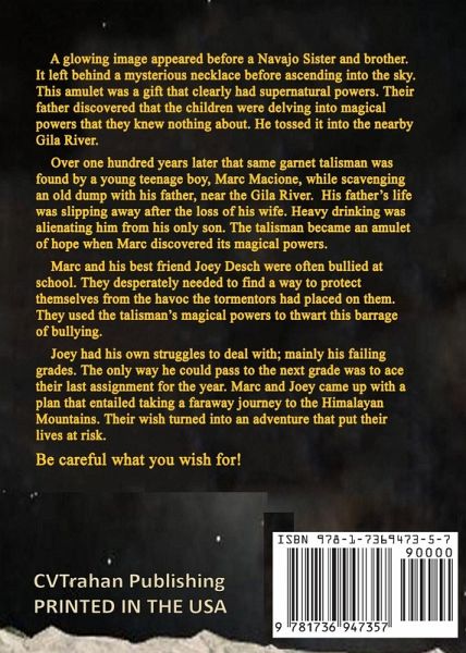 A glowing image appeared before a Navajo sister and brother. It left behind a mysterious necklace before ascending into the sky. This amulet was a gift that clearly had supernatural powers. Eventually their father discovered that the children were delving into magical powers that they knew nothing about and he tossed it into the nearby river. Over one hundred years later that very same garnet necklace was found by a young teenage boy, Marc Macione, while scavenging an old dump yard with his father, near the Gila River. His father's life was slipping down and out after the loss of his wife. Heavy drinking was alienating him from his only son. Marc was hoping to help relieve his father of his affliction. The necklace became an amulet of hope for Marc when he discovered its magical powers. Marc and his best friend Joey Desch were often bullied at school. They desperately needed to find a way to protect themselves from the havoc the tormentors had placed on them. They used the powers of the talisman to help thwart this barrage of bullying. Joey had his own struggles to deal with; mainly his failing grades. The only way he could pass to the next grade is to turn in an assignment that will surprise even his teacher. Marc and Joey came up with a plan to try and save him from failing. They made a wish that entailed taking a faraway journey to Katmandu, near the Himalayan Mountains. Their wish turned into an adventure that put their lives at risk. Be careful what you wish for.