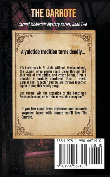 A yuletide tradition turns deadly... It's Christmas in St. Jude Without, Newfoundland, the season when pagan roots burst through the thin veil of civilization and chaos reigns. First a minister is brutally murdered, then a priest. Carmel and Inspector Darrow are thrown together again to stop this deadly purge, but can they solve this before yet another Christian leader loses her life? And can Carmel win the attention of the handsome Scots policeman, or will she mess this one up too... If you like small town mysteries and romantic suspense laced with humor, you'll love The Garrote.