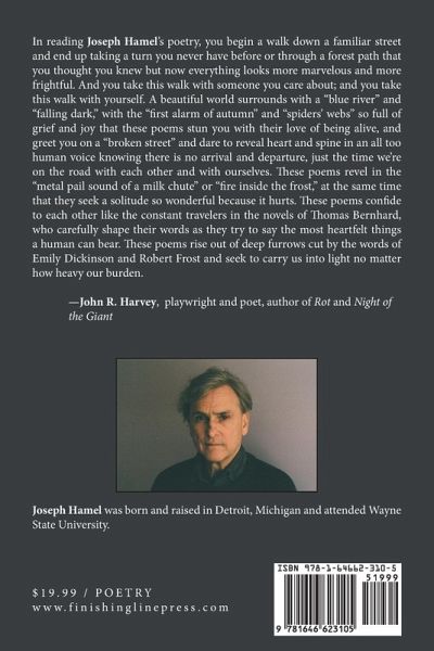 In reading Joseph Hamel's poetry, you begin a walk down a familiar street and end up taking a turn you never have before or through a forest path that you thought you knew but now everything looks more marvelous and more frightful. And you take this walk with someone you care about; and you take this walk with yourself. A beautiful world surrounds with a "blue river" and "falling dark," with the "first alarm of autumn" and "spiders' webs" so full of grief and joy that these poems stun you with their love of being alive, and greet you on a "broken street" and dare to reveal heart and spine in an all too human voice knowing there is no arrival and departure, just the time we're on the road with each other and with ourselves. These poems revel in the "metal pail sound of a milk chute" or "fire inside the frost," at the same time that they seek a solitude so wonderful because it hurts. These poems confide to each other like the constant travelers in the novels of Thomas Bernhard, who carefully shape their words as they try to say the most heartfelt things a human can bear. These poems rise out of deep furrows cut by the words of Emily Dickinson and Robert Frost and seek to carry us into light no matter how heavy our burden. -John R. Harvey, playwright and poet, author of Rot and Night of the Giant