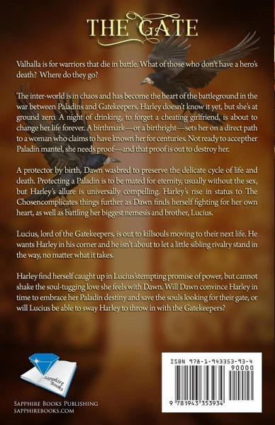 Valhalla is for warriors that die in battle. What of those who don't have a hero's death? Where do they go? The inter-world is in chaos and has become the heart of the battleground in the war between Paladins and Gatekeepers. Harley doesn't know it yet, but she's at ground zero. A night of drinking, to forget a cheating girlfriend, is about to change her life forever. A birthmark-or a birthright-sets her on a direct path to a woman who claims to have known her for centuries. Not ready to accept her Paladin mantel, she needs proof-and that proof is out to destroy her. A protector by birth, Dawn was bred to preserve the delicate cycle of life and death. Protecting a Paladin is to be mated for eternity, usually without the sex, but Harley's allure is universally compelling. Harley's rise in status to The Chosen complicates things further as Dawn finds herself fighting for her own heart, as well as battling her biggest nemesis and brother, Lucius. Lucius, lord of the Gatekeepers, is out to kill souls moving to their next life. He wants Harley in his corner and he isn't about to let a little sibling rivalry stand in the way, no matter what it takes. Harley find herself caught up in Lucius's tempting promise of power, but cannot shake the soul-tugging love she feels with Dawn. Will Dawn convince Harley in time to embrace her Paladin destiny and save the souls looking for their gate, or will Lucius be able to sway Harley to throw in with the Gatekeepers?