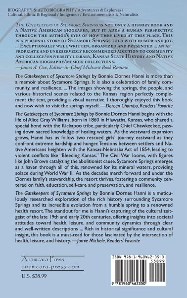 The Gatekeepers of Sycamore Springs, Kansas Historical Journey to Healing Water explores the lives and legacy of the owners of the public historical resort and how each generation made improvements for the times while preserving the nature of the crystal clear spring water. This is a book about Sycamore Springs and "the healing waters." The author presents a progression of documented events-a collection of observations along the historical journey-that lead us to the sycamore land and bring us to the present day. A journey worth taking. History gives us perspective, but the future is still untold. People, places, and time determine the past. Our ancestors set the course. What and where and how they lived brings every one of us to the present. Alice Gray had a story too. It has made an impact on many lives. Her history provided her a perspective of exploration and determination to understand the healing waters. Her story remains the beginning of the author's story. This well worn path is part of Hanni's history. Her family is associated with Sycamore Springs in a very small way. They owned and lived at this historical resort from 1949 - 1966. They called it home and added to the history of Sycamore Springs. Each person who came to Sycamore Springs contributed to this story; including you. You, the reader, are a vital part of this history. The Gatekeepers of Sycamore Springs is not only a history book but adds a human perspective through the author's eyes of how they lived at this place. A personal story of Sycamore Springs told with humor and joy.