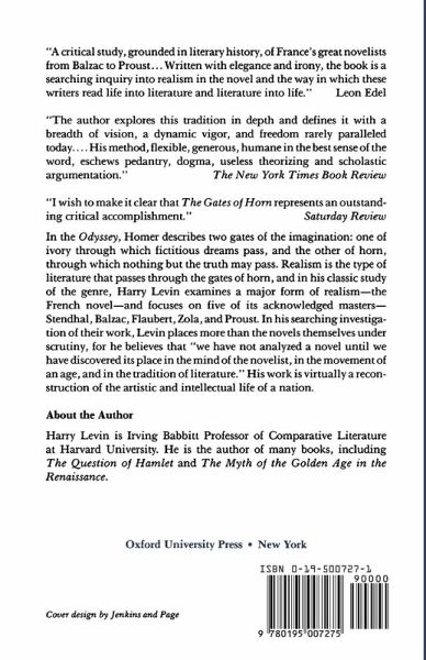"The author explores this tradition in depth and defines it with a breadth of vision, a dynamic vigor and freedom rarely paralleled today....His method, flexible, generous, humane in the best sense of the word, eschews pedantry, dogma, useless theorizing and scholastic argumentation."--The New York Times Book Review. "I wish to make it clear that The Gates of Horn represents an outstanding critical accomplishment."--Saturday Review. In the Odyssey, Homer describes two gates of the imagination: one of ivory through which fictitious dreams pass, and the other of horn, through which nothing but the truth may pass. Realism is the type of literature that passes through the horn, and in this significant study of the genre Levin examines a major form of Realism--the French novel--and focuses on five of its masters--Stendahl, Balzac, Flaubert, Zola, and Proust. Now available in paperback, Levin's study is a veritable reconstruction of the artistic and intellectual life of a nation.
