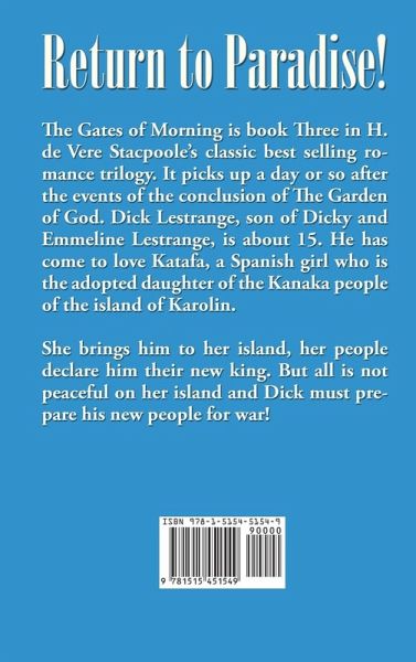 The Gates of Morning is book Three in H. de Vere Stacpoole's classic best selling romance trilogy. It picks up a day or so after the events of the conclusion of The Garden of God. Dick Lestrange, son of Dicky and Emmeline Lestrange, is about 15. He has come to love Katafa, a Spanish girl who is the adopted daughter of the Kanaka people of the island of Karolin. She brings him to her island, her people declare him their new king. But all is not peaceful on her island and Dick must prepare his new people for war! Henry De Vere Stacpoole was a best selling Irish author with more than 50 novels to his credit. After a brief career as a ship's doctor, which took him to numerous exotic locations in the South Pacific Ocean that he later used in his fiction when he became a full-time writer.