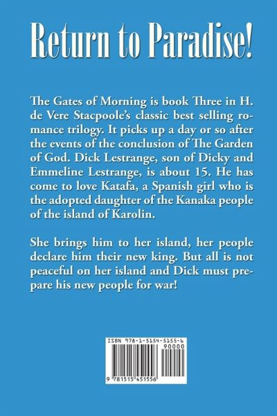 The Gates of Morning is book Three in H. de Vere Stacpoole's classic best selling romance trilogy. It picks up a day or so after the events of the conclusion of The Garden of God. Dick Lestrange, son of Dicky and Emmeline Lestrange, is about 15. He has come to love Katafa, a Spanish girl who is the adopted daughter of the Kanaka people of the island of Karolin. She brings him to her island, her people declare him their new king. But all is not peaceful on her island and Dick must prepare his new people for war! Henry De Vere Stacpoole was a best selling Irish author with more than 50 novels to his credit. After a brief career as a ship's doctor, which took him to numerous exotic locations in the South Pacific Ocean that he later used in his fiction when he became a full-time writer.