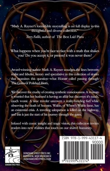 "A delightful collection of stories ranging across genres, whose recurring motif is the distinction between what is real and unreal, a true and a false dream. What this in turn leads to is the raising, usually in a lighthearted way, of the sort of moral questions we'll soon be having to deal with more frequently. ~ Alex Good, Toronto Star What happens when you're face-to-face with a truth that shakes you? Do you accept it, or pretend it was never there? Award-winning author Mark A. Rayner smudges the lines between realist and fabulist, literary and speculative in this collection of stories that examines this question-what Homer called passing through The Gates of Polished Horn. We discover the cruelty of creating synthetic consciousness. A woman is worried that her husband is having an affair but discovers it's much, much worse. A time traveler uncovers a reality-bending fact while observing the death of Socrates. Waldo, of Where's Waldo fame, has an existential crisis. A traveling salesperson is killed on the highway, and this is just the start of his journey through the gates. Infused with comic insight and tragic vision, this collection invites readers into new realities that touch on our shared humanity. "Mark A. Rayner's formidable storytelling is on full display in this thoughtful and diverse collection. He's a fine and creative writer whose characters and storylines are quirky, inventive, and often very funny. Bravo!" ~Terry Fallis, two-time winner of the Stephen Leacock Medal for Humour