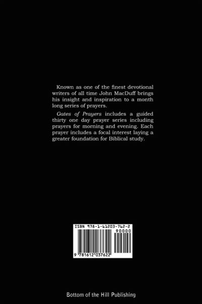 Known as one of the finest devotional writers of all time John MacDuff brings his insight and inspiration to a month long series of prayers. Gates of Prayers includes a guided thirty one day prayer series including prayers for morning and evening. Each prayer includes a focal interest laying a greater foundation for Biblical study.